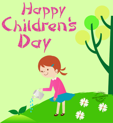Animated girl watering a plant, celebrating Happy Children's Day with glitter text and a cheerful green background.