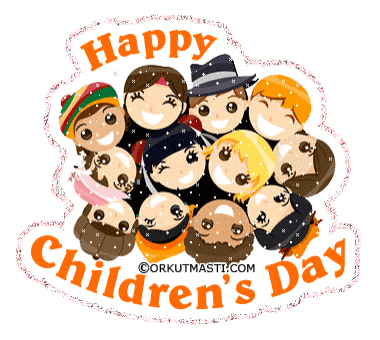 Bright and cheerful Children's Day greeting featuring a group of smiling kids with sparkling effects.