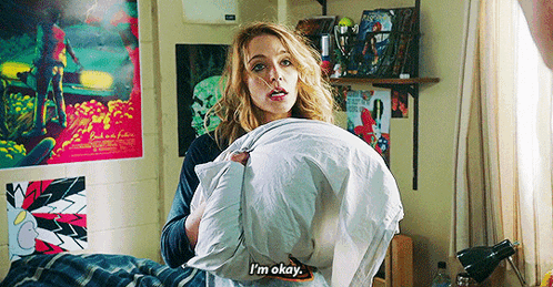 a woman is laying on a bed holding a white shirt and saying i 'm okay .