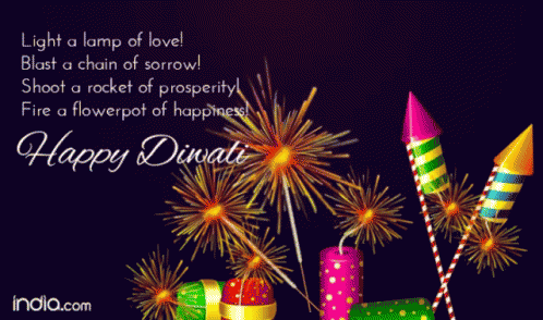 A vibrant Happy Diwali and Dhanteras greeting card featuring fireworks and festive wishes.