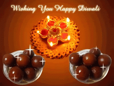 A festive greeting card wishing Happy Diwali and Dhanteras, featuring sweets and a candle.