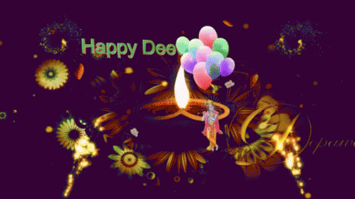 A vibrant animated greeting for Diwali featuring a glowing diya, colorful balloons, and festive floral designs.