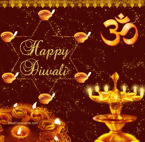 A vibrant Happy Diwali greeting card featuring traditional diyas, an Om symbol, and sparkling glitter.