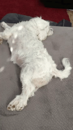 A fluffy white dog lies on its back on a couch, happily dreaming and wagging its tail.