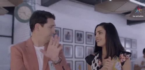 A happy couple laughing and hugging, with 'Las Estrellas' visible in the background.