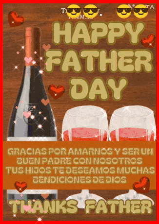 A heartfelt Father's Day greeting card featuring wine, glasses, hearts, and a bilingual message of love and blessings.
