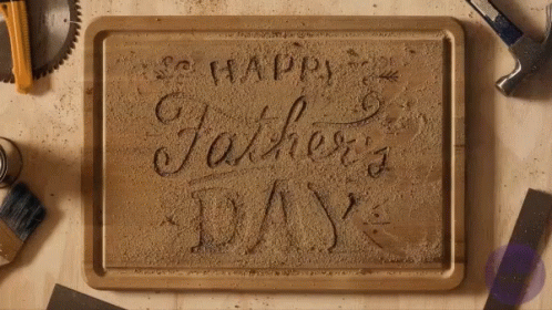 A beautifully carved wooden cutting board displays the message 'Happy Father's Day', surrounded by woodworking tools.