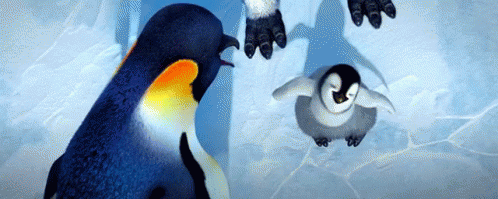 Mumble the penguin from Happy Feet joyfully interacts with another emperor penguin on the ice.