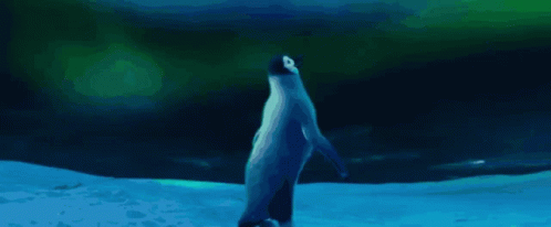 Mumble the penguin from Happy Feet Two gazes up at the stunning Aurora Borealis.