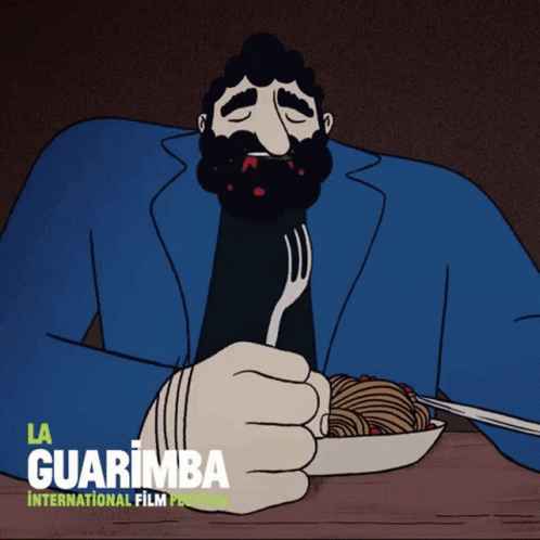 An animated man with a beard happily devours a large bowl of spaghetti, featured by La Guarimba Film Festival.