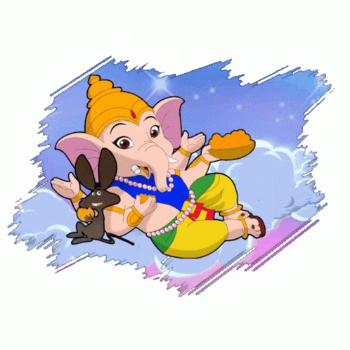 A vibrant cartoon depiction of Lord Ganesha celebrating Ganesh Chaturthi with a mouse.