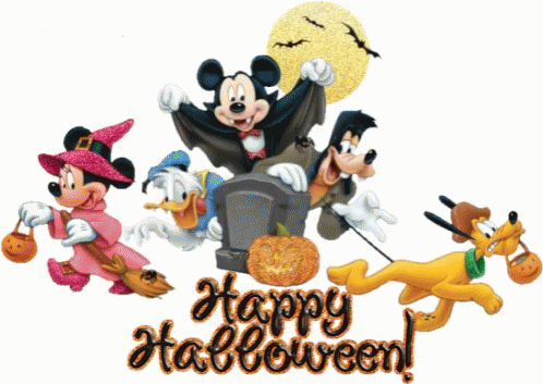 Mickey Mouse, Minnie Mouse, Goofy, Donald Duck, and Pluto celebrate Happy Halloween with glitter.