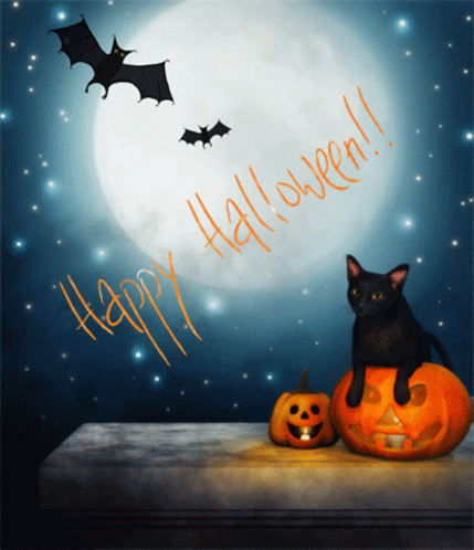 A black cat sits on a glowing jack-o'-lantern with bats flying under a full moon, wishing Happy Halloween.