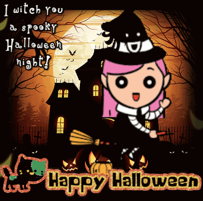 A cute cartoon witch flies across a haunted house scene with pumpkins and a black cat, wishing a spooky Halloween night.