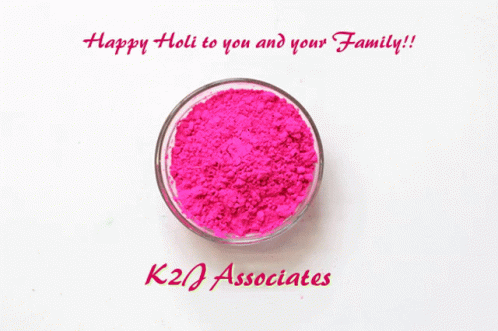 A vibrant Happy Holi greeting with a bowl of colorful powder changing from pink to yellow to green.