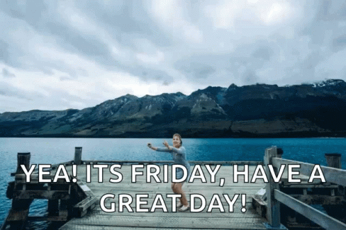 A person joyfully jumping on a dock by a scenic lake, celebrating Friday.