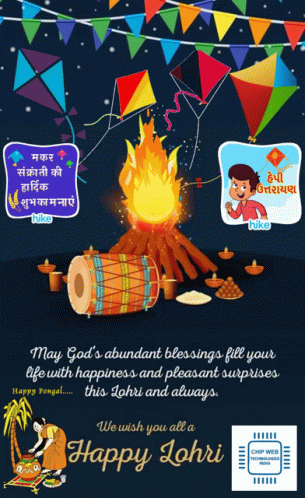 Celebrate Lohri, Makar Sankranti, Pongal, and Uttarayan with this vibrant greeting featuring a bonfire, kites, and traditional elements.