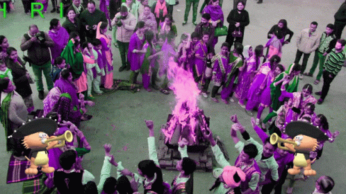 People celebrate Happy Lohri around a colorful bonfire, accompanied by animated mariachi characters playing trumpets.