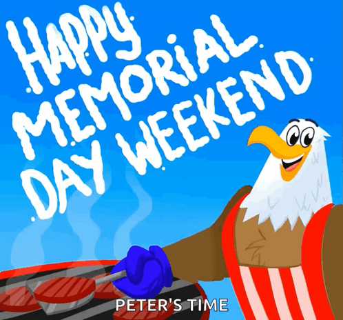 A cheerful cartoon bald eagle grills burgers for a Happy Memorial Day Weekend barbecue, with the text 'PETER'S TIME'.