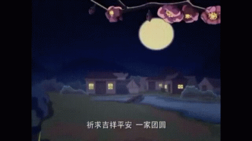 An animated scene celebrating the Mid-Autumn Festival with a full moon, traditional houses, and a wish for peace and family reunion.