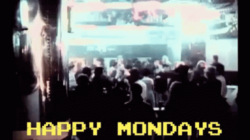 Happy Mondays' Shaun Ryder and Bez dancing energetically in a vibrant, crowded club scene from the Wrote For Luck era.