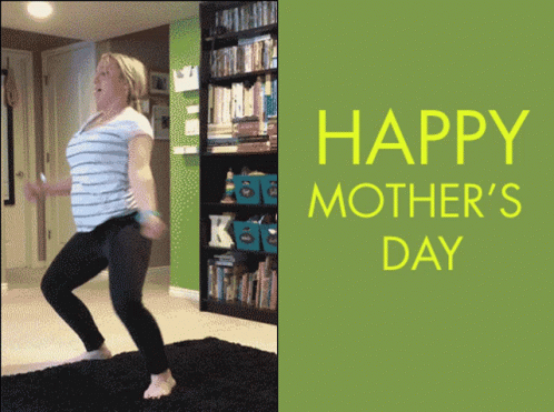 A woman joyfully dances in front of a 'Happy Mother's Day' message, celebrating the special day.