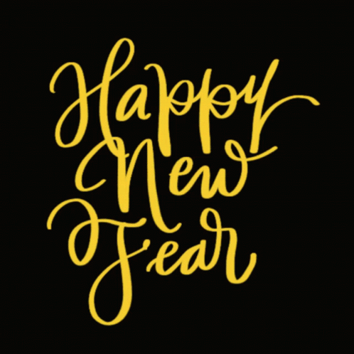 A festive 'Happy New Year' message in yellow cursive text on a black background, adorned with sparkling gold glitter and stars.