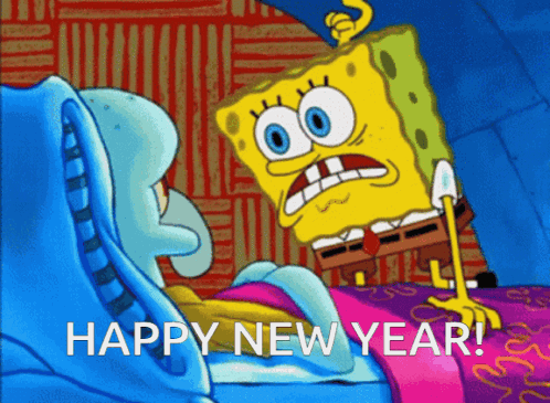 Spongebob enthusiastically wakes a sleepy Squidward to wish him a Happy New Year, much to Squidward's annoyance.
