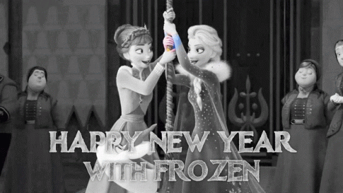 Anna and Elsa from Disney's Frozen celebrate the New Year, pulling a rope with Olaf the snowman.