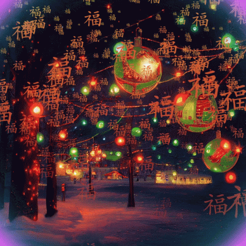 A vibrant Happy New Year 2024 celebration with neon lights, festive ornaments, and Chinese characters for good fortune.