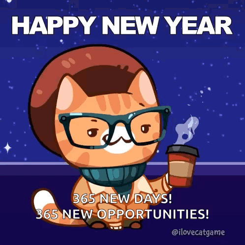 A cute animated cat in glasses and a hat wishes a Happy New Year 2025, celebrating 365 new days and opportunities.