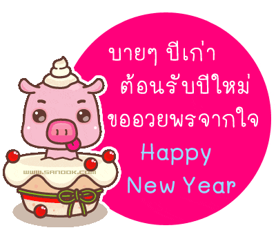 Adorable cartoon pig with a cupcake on its head, wishing a Happy New Year.