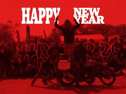 A person joyfully jumps over a Royal Enfield motorcycle during a vibrant Happy New Year celebration, surrounded by a cheering crowd.