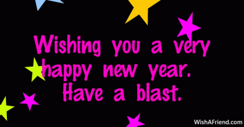A vibrant animated greeting wishing a very happy New Year with colorful stars and text.