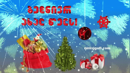 Animated Georgian New Year's greeting with a festive Christmas tree, gifts, and falling snow.