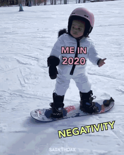 A determined child snowboarder navigates the challenges of 2020, represented by text overlays like 'Toxic People' and 'Self-Doubt'.