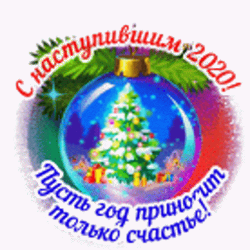 Animated New Year 2020 greeting card featuring a festive Christmas ornament with a tree inside.