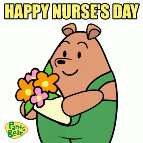 Pants Bear celebrates Happy Nurses Day, holding a vibrant bouquet of orange and pink flowers.