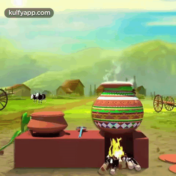 Animated scene of a traditional Pongal celebration with a pot boiling over a fire in a vibrant village setting.