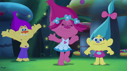 Poppy and her Trolls friends, including Smidge, dance joyfully in a vibrant cartoon forest.