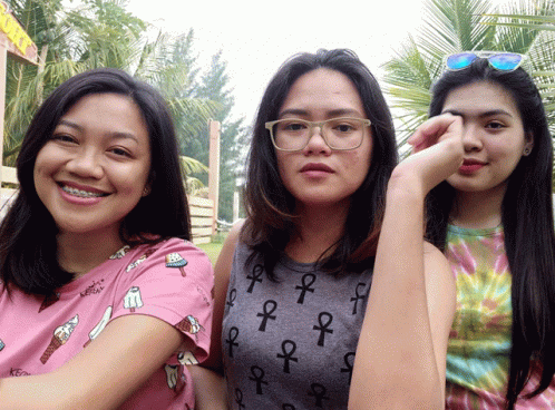 Three friends posing happily for a picture, one wearing a shirt with ankh symbols.