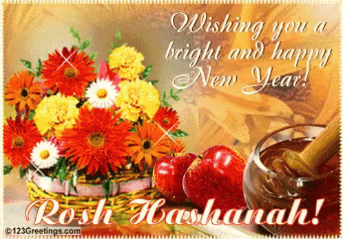 A festive greeting card wishing a bright and happy Rosh Hashanah and New Year, featuring flowers, apples, and honey.