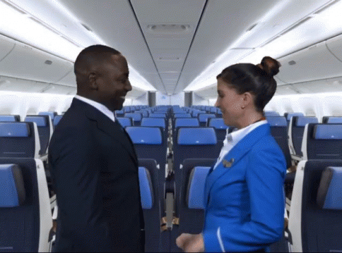 KLM flight attendant and male colleague share a happy high-five inside an airplane cabin.