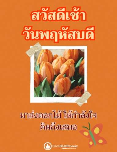 A vibrant orange greeting card with Thai text for Happy Thursday, featuring orange tulips and a butterfly.