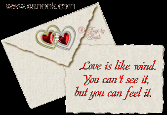Valentine's greeting with an envelope, red hearts, and a quote: "Love is like wind. You can't see it, but you can feel it."