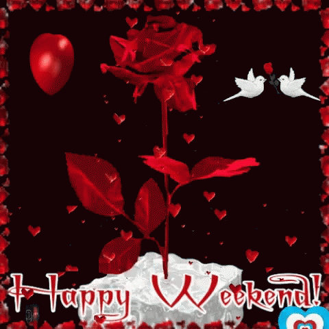 A vibrant 'Happy Weekend!' greeting featuring a red rose, floating hearts, and two white doves, for Bahonon, Jayjay, and Opely.