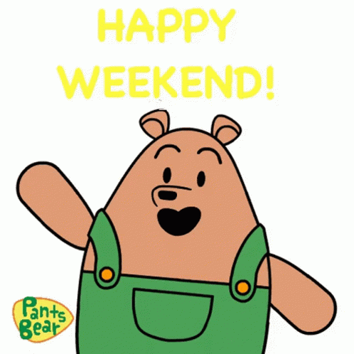 Adorable cartoon bear dancing with 'Happy Weekend' message, perfect for sharing weekend joy.