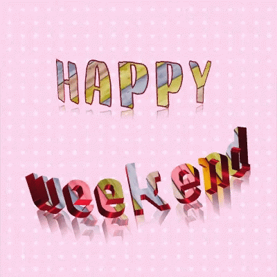 Vibrant, animated 'Happy Weekend' message displayed in colorful 3D letters on a cheerful pink background.
