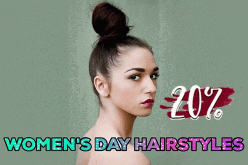 Celebrate Women's Day with stylish hairstyles, featuring a woman with a chic high bun and a 20% discount offer.