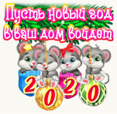 Cute mice celebrate Happy New Year 2020 with hope, joy, and love, holding Christmas ornaments.